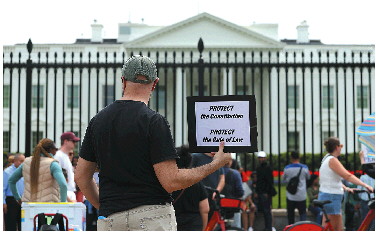 4月19日,人们在白宫门前参加抗议政府加征关税、裁员等活动。 新华社发