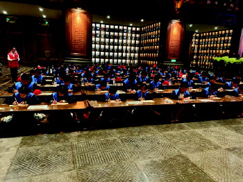 抵达曲阜后,同学们首站来到尼山书院。书院的一砖一瓦、一草一木都承载着厚重的历史,古松柏、铭文碑刻、石板路,无一不让同学们深切感受到儒家文化的源远流长。随后,他们步入尼山圣境核心区。72米高的孔子铜像在阳光下闪耀,同学们登大学之道,手抄《论语》,游览“七十二贤廊”与“仁义礼智信五厅”,深入感悟夫子思想与礼乐文明。