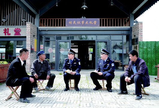 民警于村民议事大礼堂前与干群围坐解矛盾。 通讯员 李猛 摄