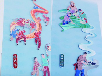 大厅两侧的六根“三合一”功能立柱,既是保障安全的基础设施,也是文化展示的载体。蓝白立柱上镶嵌12幅珐琅壁画,分两部分讲述日照故事:一侧是绿茶、煎饼等舌尖上的特产,茶香与麦香仿佛透过画面溢出;另一侧则定格迎日祈福、渔民节、高跷推虾等民俗场景,非遗技艺与海洋生活的交融跃然墙上。这些立柱如同六根“文化支柱”,支撑起候车空间的同时,也让旅客在等待中品读日照的多元魅力。