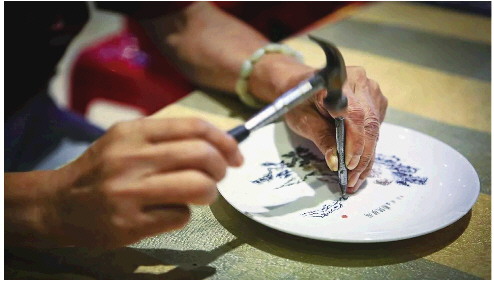 老陈,就是在瓷器上搞活的人。有“两把刷子”,更有几把锤子和凿子,他是瓷刻省级非遗传承人。