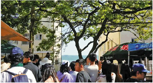 午后耀眼的阳光并没有阻挡游客们排队的热情。游客韩女士和朋友从河北石家庄而来,到下午2点半,他们已经排了接近50分钟的队。“我是在网上刷到这个打卡地点的,看着很漂亮,有海又有氛围感,就想过来拍照,而且这里还是《当我飞奔向你》的拍摄地,就想来打卡。”韩女士说,这次青岛之旅的攻略基本是跟着网上推荐的打卡点来的,除了“孤独的树”和琴屿路,他们还去打卡了西陵峡路“通往大海的路”拍照点。“看到网上的打卡攻略,自己也想来看看。”韩女士说。