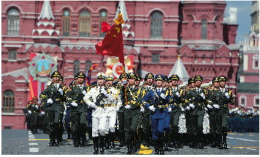 5月9日,在俄罗斯首都莫斯科,中国人民解放军三军仪仗队方队参加纪念苏联伟大卫国战争胜利80周年阅兵式。 新华社发