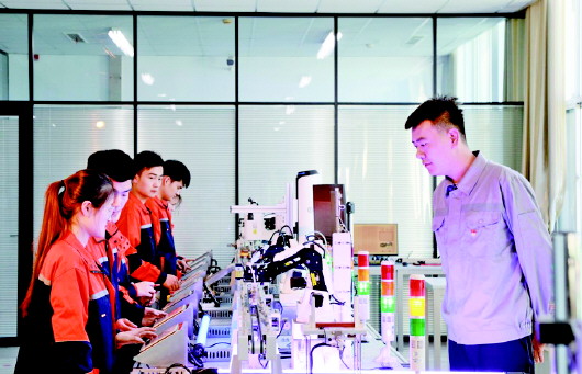 在临沂职业学院智能制造实训基地中,学生们操作着与当地企业同型号的工业设备,来自企业的工程师来到学生身边,现场指导他们调试程序与设备。这处由临沂职业学院、沂河新区、上海金东唐共建的产学研一体化公共实训基地,是山东省内首个以政校企联合模式建设运行的基地,并获批教育部职业教育示范性虚拟仿真实训基地。