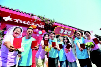 当天,由德州市福利彩票发行中心和德城区民政局联合打造的运河古街婚姻登记巡回点揭牌启用,4对新人在仪式现场领到了结婚证。