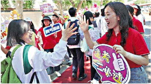 6月4日,济钢中学高三学子迎来离校的日子。老师们身着红色T恤,手持写有“金榜题名”“高考必胜”等字样的牌子在校园内列队欢送,为每一位学子击掌鼓励,传递信心与力量。学校还特别设置了“前程似锦”大门,同学们依次穿过,象征着他们即将开启人生新的征程,带着梦想与祝福奔赴高考考场。 记者 王鑫 摄影报道