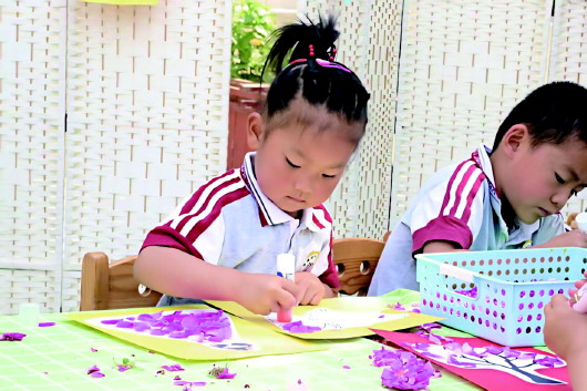 学生用玫瑰花瓣做手工画。