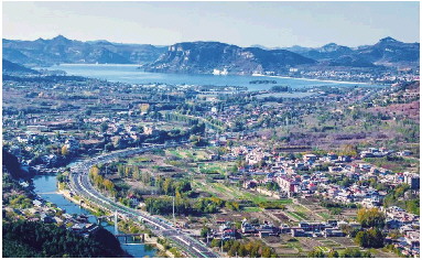 6月5日,选择假期错峰出行的游客从红符路进入省道103,在北侧山口,有不少人在下坡处打开手机拍照,镜头里面,是南部山区独特的自然景观,山与湖交相辉映,村庄错落有致。