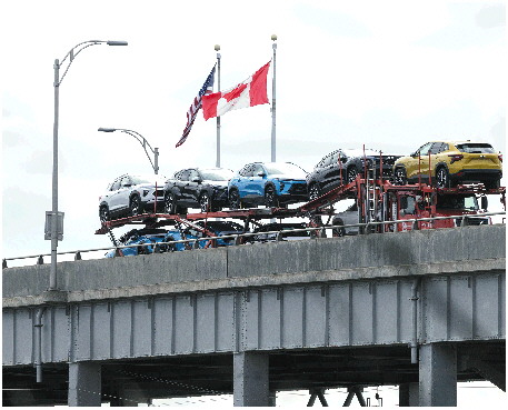 4月9日,一辆满载的汽车运输车通过加美边境地带的刘易斯顿-昆斯顿桥开往加拿大。 新华社发