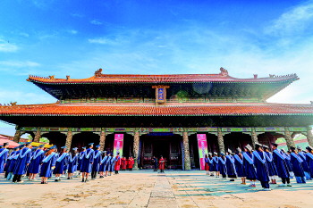 曲阜市文物局、曲阜市三孔文化旅游服务有限责任公司联合曲阜师范大学历史文化学院、孔子文化研究院,从中华优秀传统文化的深厚沃土中汲取灵感,精心打造新时代中国特色学成礼。此次学成礼中,特别设置了礼敬先师、诵读经典等环节,学子们向至圣先师孔子像行传统揖礼,深表尊崇。“诵读经典”之声在庙宇间朗朗回响,激发了毕业生责任担当意识和家国情怀。