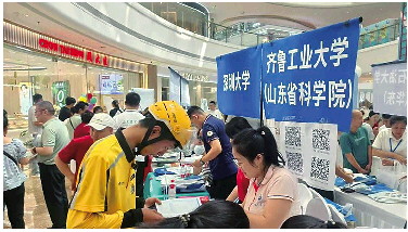 他急匆匆地穿梭在各个学校的咨询台之间。在齐鲁工业大学展位前,他弓着身,额头汗珠未干,眼神中满是期待,招生老师抬头看到这身装扮,明显愣了一下:“同学你这是……”