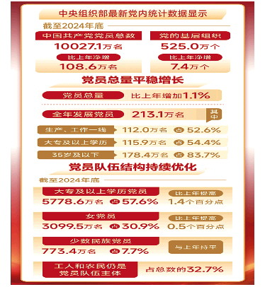 新华社北京6月30日电 中央组织部最新党内统计数据显示,截至2024年底,中国共产党党员总数为10027.1万名,比上年净增108.6万名。党的基层组织525.0万个,比上年净增7.4万个。中国共产党坚持用改革精神和严的标准管党治党,着力建强基层组织、锻造过硬队伍,为以中国式现代化全面推进强国建设、民族复兴伟业提供坚强组织保证。
