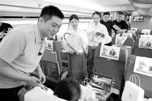 除了产品分发,列车车厢内还张贴着以菏泽牡丹为主题的文化窗花,将“牡丹之都”的独特魅力巧妙地融入到了旅途的每一处细节之中,让旅客仿佛置身于牡丹的海洋,沉浸在浓厚的牡丹文化氛围里。