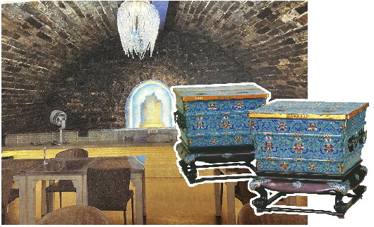 古人藏冰,一般是头年冬季从河湖中取冰块,藏于冰窖之中,以备来年使用。紫禁城里也有藏冰用的冰窖。据《大清会典》记载,紫禁城历史上曾有五座冰窖,可藏冰两万五千块。今天的故宫博物院内存有冰窖四座,坐落在隆宗门外西南约一百米处,外表都是硬山屋顶、灰瓦面的样式,形制完全相同。冰窖内部为半地下结构,室内向地下延伸两米,内部空间不大,六十多平方米。冰窖的地面铺满大块条石,一角留有沟眼,融化的冰水可由此流入暗沟,通过附近的旱井排出室外。冰窖四面无窗,墙体都是两米厚的石墙,房顶做成拱券顶棚的样式,以便更好地保持低温。我们今天看到的冰窖已被改造成了餐厅,临时增设了楼板及支撑楼板的木柱,将内部空间分为上、下两部分,但冰窖内部的原始空间并未受到扰动。