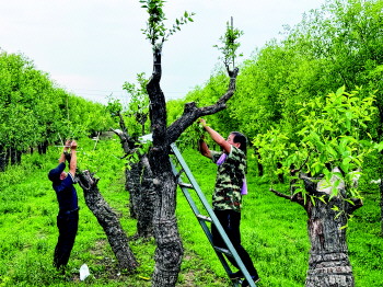 7月2日,在乐陵市国有林场的“金丝四号”推广项目嫁接老枣树示范园内,枣农为百年老枣树嫁接成活的“金丝四号”新枝绑竹竿固定,防止大风天气将新芽刮掉。据介绍,该项目既能保护百年枣树的文化价值,又提高经济价值,市场前景广阔,预计每亩效益提高40%,目前示范园内已经嫁接完成,进入正常管理状态。 (马志勇 刘超 德州报道)