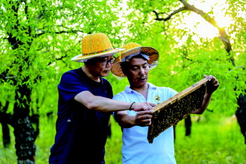 路会超(右)和朱集蜂农合作社负责人刘猛查看蜜蜂产蜜情况。