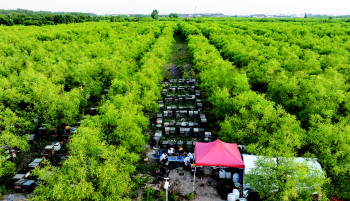 近日,在乐陵市朱集镇枣博园的枣林间,120多个蜂箱排得整整齐齐,无数只胖绒绒的小蜜蜂,围着蜂箱扑棱着小翅膀嗡嗡鸣唱,像给枣花唱赞歌。