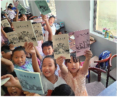 孩子们高兴地展示支教老师送来的礼物——印有名牌大学图案的笔记本。