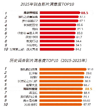 凭借历史真相的分量、立体感人的群像和强大的情感共鸣,影片自点映以来便掀起观影和讨论的热潮。在中国电影艺术研究中心联合艺恩发布的中国电影观众满意度调查中,《南京照相馆》以88.5分的高分位居“2025年调查影片满意度TOP10”榜单首位,这一成绩超过了“春节档爆款”《哪吒之魔童闹海》。在“历史调查影片满意度TOP10(2015-2025年)”榜单中,《南京照相馆》位居第六位,与《我和我的祖国》《长津湖》《战狼2》《长津湖之水门桥》《建军大业》分差不大。