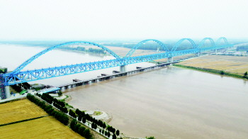 在济宁市梁山县雄商高铁黄河特大桥施工现场,奔腾不息的黄河水面波光粼粼,映衬着河面上雄商高铁黄河特大桥建设现场的忙碌有序。
