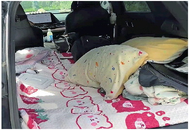 “车轱辘转起来就有钱挣。”这是孟浩(化名)跑长途顺风车的第二个年头。这辆后排能放倒的电车,就是他流动的家——后备箱里塞满被褥、换洗衣物和泡面,座椅放平铺着褥子。