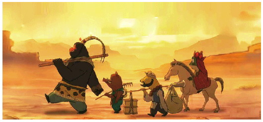 电影开头延续动画片的情节,小猪妖为得到奖赏不惜用身体擦锅,反被大王指责擦掉了“太爷爷留下的字”。在大王洞,作为工具人的小妖们遭受着各种职场困境,小猪妖犯了小错误惨遭追杀,在“今亡亦死,举大计亦死”的两难时刻,他和蛤蟆精商量着冒充唐僧师徒去取经,不吃大王画的饼,而是用自己的方式实现“长生不老”。