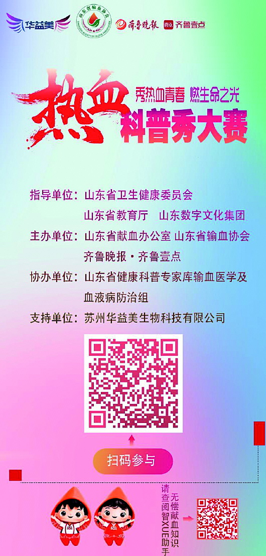 为进一步科学普及无偿献血和血液安全知识,提升公众健康素养,营造无偿献血良好社会氛围,2025年8月18日,在山东省卫生健康委员会、山东省教育厅、山东数字文化集团的指导下,齐鲁晚报·齐鲁壹点联合山东省输血协会、山东省献血办公室发起“秀热血青春·燃生命之光”山东省第二届“热血科普秀”大赛。