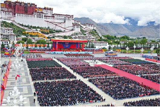 8月21日上午,西藏各族各界干部群众约2万人欢聚拉萨市布达拉宫广场,热烈庆祝西藏自治区成立60周年。这是庆祝大会现场。                新华社发