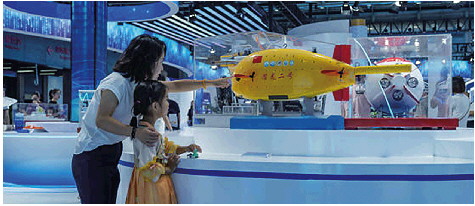 一位家长带着孩子在参观“蛟龙二号”模型。