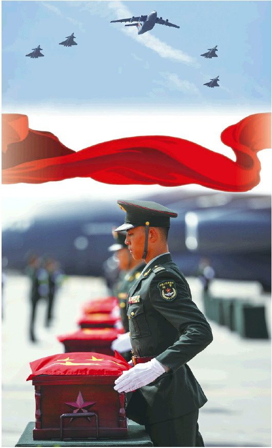 9月12日10时57分,载运第十二批30位在韩中国人民志愿军烈士遗骸及267件遗物的中国空军专机降落在沈阳桃仙国际机场,英雄们回到祖国怀抱。12日上午,空军运-20专机进入中国领空后,空军4架歼-20战斗机护航,运-20使用“跨江50”呼号,4架护航的歼-20使用“凯旋”呼号,“双20”列阵长空告慰革命先烈,表达崇高敬意。编队在机场上空通场,桃仙国际机场以“过水门”最高礼仪迎接英烈回家。