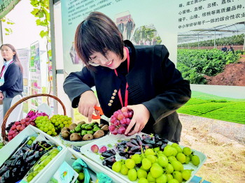 活动现场,种植户正在分享丰收的葡萄。