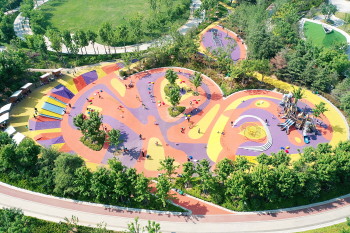 即墨区岘山公园里,绿树环绕的儿童乐园。