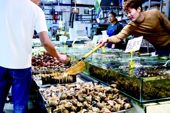 “李红大美丽品食”店的老板孙先生介绍,自家店里鱼类、虾类、贝类等种类齐全,最近临近假期,生意格外好,帝王蟹每天都能卖出去10多只。