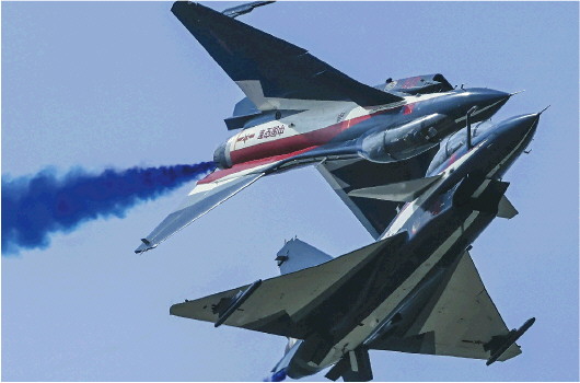 双“龙”会。八一飞行表演队的歼10“猛龙”战机表演双机拉烟缠绕飞行,惊艳四座。
