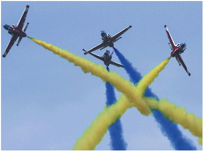 ◥红鹰飞行表演队的K8教练机表演特技飞行,像在空中打了一个美丽的结。