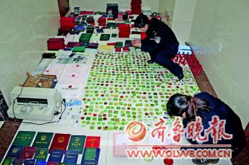 本报96706热线消息(记者 殷亚楠 通讯员 林毅奕) 经一个多月的缜密侦查,日前,济南市公安局直属支队一举捣毁一个制贩假证窝点,当场抓获伪造、买卖证件违法嫌疑人4人,查获假公章、印章模板近千枚,收缴各类伪造证照、证书4000余本。目前相关嫌疑人已被治安拘留。 11月初,根据前期群众举报,经过一个月的深挖细查,济南市公安局直属支队发现,一伙人在堤口路附近长期从事伪造、买卖假证件活动。12月2日13时许,支队民警在张庄路附近巡逻时,发现违法嫌疑人邹某(女,36岁,湖南省双峰县人),在张庄路的一处公交站牌旁进行假证交易。根据事先掌握的情况,支队民警迅速出击,当场将邹某和两名购买假证的违法嫌疑人田某(女,28岁,山东省巨野县人)、胡某(男,22岁,吉林省公主岭市人)抓获控制,并查获假税务登记证一套。 随后,直属支队民警根据邹某提供的情况,在其家中查获假印章、假证件一宗及制假设备打印机一台。在邹某的制假仓库里,民警们还发现另一名违法嫌疑人王某(男,44岁,湖南省双峰县人)并将其抓获,又查获一台打印机和涉及五百余个单位的假公章、印章模板近千枚,收缴伪造国家机关、各大院校颁发的各类房屋所有权证、组织机构代码证、营业执照、身份证、毕业证以及各类资质证书等成品、半成品、空白件4000余本。 由于胡某为毫不知情者,目前,邹某、王某、田某三人已依法被治安拘留,案件正在进一步调查审理中。