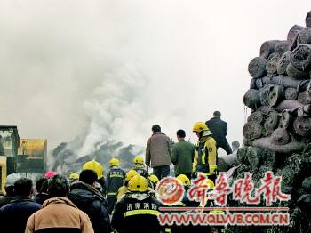 数千捆毡布被烧,冒起滚滚浓烟。