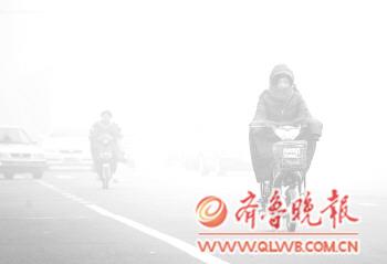 4日上午8时许,市民身着棉衣骑行在浓雾中的府前大街上。3日开始,大雾弥漫东营。据气象部门预报,5日东营地区仍将有雾,大雾降温将可能给东营带来雨雪天气。