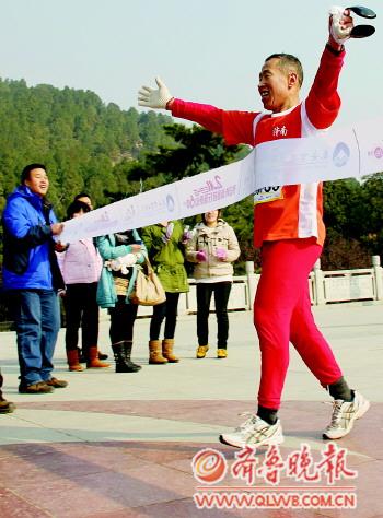 3日上午7点,第三届环泰山60公里大暴走活动拉开帷幕,1572名来自全国各地的驴友们整装出发。中午12点11分,第一名驴友顺利回到终点天地广场。 3日,天还蒙蒙亮,天地广场上已经聚集上千名驴友。“徒步的路程比较长,山上还有积雪,活动后段有可能需要公路夜行,请大家一定带上头灯或者手电筒,注意安全。”此次徒步活动的组织者青云拿着扩音喇叭不断向驴友们强调着。早晨6时30分,驴友们在天地广场东侧集结,除了泰安本地外,还有来自北京、上海等地的驴友。7时队伍准时出发。这支近2000人的队伍,围着泰山浩浩荡荡地前进。有的驴友将整张脸用头巾围住,只留出两只眼睛,有的驴友穿着薄薄的单层秋裤就上阵了。一名驴友的背包里露出3根不同颜色的管子。他告诉记者:“这3根管子,一根用来吸水,一根吸奶,还有一根是吸氧的。” 上午9时30,在此次活动的半程终点黑风口,风很大,山周围没融化的积雪已经结冰,一位中年人昂首挺胸地跑来,虽然赛程过半,但他丝毫没有显露出疲惫。这位名叫“笑鱼歌”的驴友,来自淄博阿曼驿站旅游俱乐部,与他同时参赛的还有7名队友。“登泰山保平安,我已经连续三年参赛,这项活动让我结实许多新朋友,不仅锻炼身体还能收获友谊。”“笑鱼歌”说,他明年还要来泰山参赛。 泰山E545户外运动俱乐部负责人“飞鹰”介绍,此次环泰山大暴走活动参加人员创出新高,比上届的600多人增加了一倍多,包括活动义工和自发跟随行走的市民,活动的总人数达到2100余人。为吸引众多爱好者的参与,本届活动新增了面向初次参与者和爱好者的环泰山60公里大徒步半程附加赛和以锻打团队精神为内核的“首届环泰山60公里毅行赛。其中1452人参加60公里徒步,有30个团队组合参加毅行赛。 最终,济南选手曹榕蔚以5小时13分10秒获得本届60公里徒步男子组冠军,泰安驴友“贝壳里的海”以6小时01分45秒获得女子组冠军;张秀峰以2小时9分27秒获得半程赛男子组冠军,穆兆文4小时25分50秒获得女子组冠军;由“漫天飞雪”(女)、“秋雨”、“水木”和“扬杨羊”组成的“梦队组合”以6小时40分10秒获得首届毅行赛冠军。671名完成60公里全程的参赛者全获得“伟业钢铁泰山行者”称号。