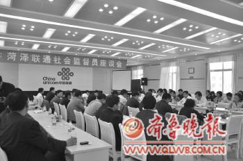 | ▲菏泽联通营业人员热情周到的为客户办理业务(资料图)。 |  | ▲菏泽联通召开社会监督员座谈会(资料图) |