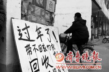 快过年了,不少临时租户因为年后不再回来,很多东西难带走,就直接选择了变卖。9日上午,在罗庄的大街上,一家回收商店以轻松的语言打出广告。
