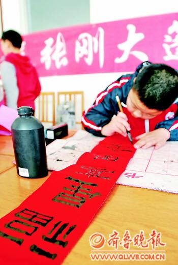 ▲14日,张刚大篷车开到东营实验学校。学生带上毛笔来到学校写春联送祝福。 本报记者 任小杰 摄