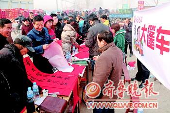 ◥14日,张刚大篷车开进德州黄河涯镇王村店,三位书法家为赶集的群众送上了春联和福字。 本报记者 马志勇 摄