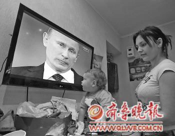 | ▲支持者举着普京的头像集会支持普京。 |  | ◤一位年轻的俄罗斯妈妈一边照看孩子一边收看有关普京的电视新闻。 |