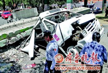 | 20日,墨西哥城警察聚集在地震中被毁坏的桥梁和车辆旁。 |