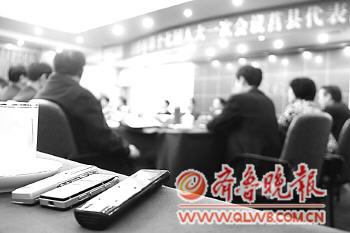 21日下午,莒县代表团分组审议政府工作报告,记者们的录音笔摆放在录音效果最好的位置。 本报记者 刘涛 摄