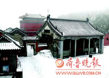 21日下午,泰山降下鹅毛大雪,银装素裹。山下小雨中夹着冰粒。专家称近期天气异常是受“极地冷涡”影响。
