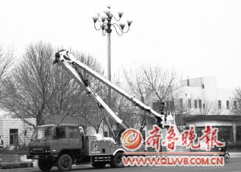 26日下午,工人们正在更换府前大街上坏掉的路灯和灯罩。