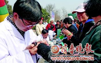 28日上午,在英雄山赤霞广场,济南市科协联合相关部门为市民献上了一道科普大餐。图为市计量检定所的工作人员正在为市民免费检测珠宝玉石。