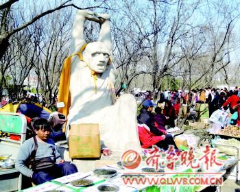 自述:三月三庙会,罗汉雕塑被摊位重重包围。